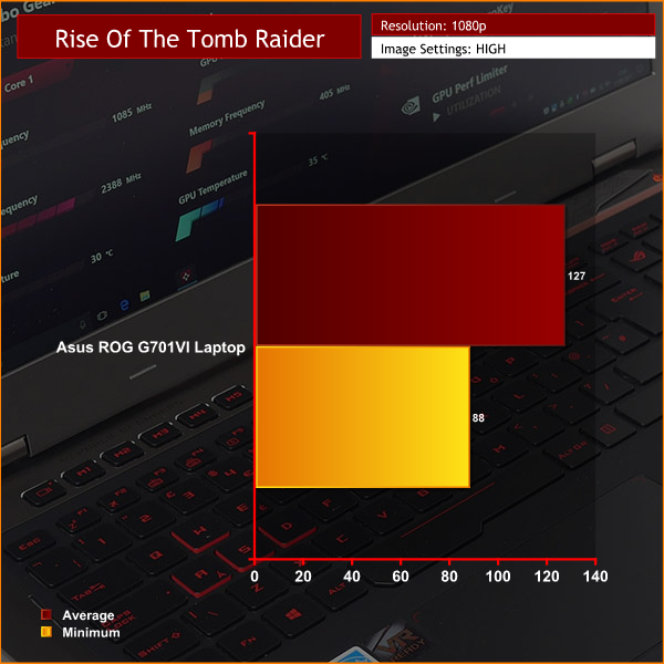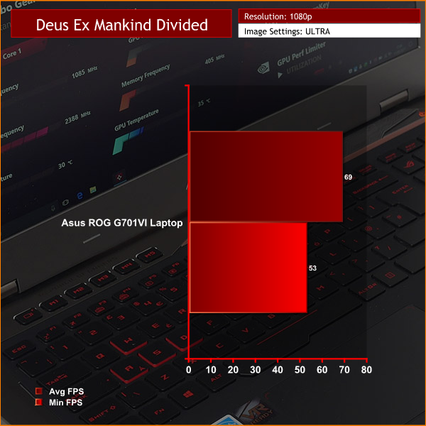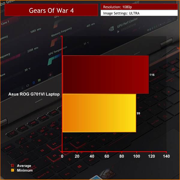 Gaming performance is simply epic. The GTX 1080 GPU delivers superb frame rates, such that the minimum frame rate in Deus Ex is 53fps and the average is 69fps. In Gears of War 4 the average frame rate is 116fps and yes, that is at Ultra quality settings.