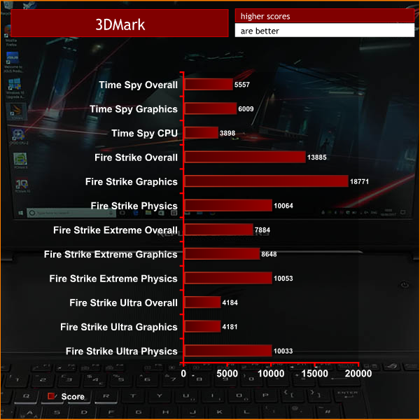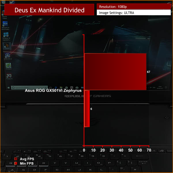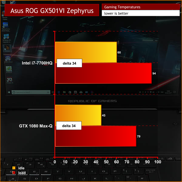 We never expected that Zephyrus would match a laptop with a ‘full-blown' GTX 1080 and we were quite correct. We are not running the figures from the ROG G701VI side-by-side with the ROG GX501VI Zephyrus as we did not test the two laptops at the same time. There are clear differences but the surprising fact is that Max-Q runs in the same ballpark as the previous, higher clocked GTX 1080.