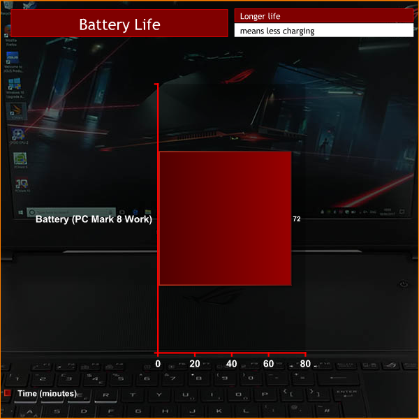 Battery life is poor. The 50Wh/3255mAh battery has presumably been sized to fit in the available space under the keyboard and the result is about two and a half hours of real world battery life. This isn’t necessarily a problem in a thick, chunk, heavy laptop but Zephyrus is so thin and light you will want to take it on your travels. The battery life is likely to prove a real limitation.
