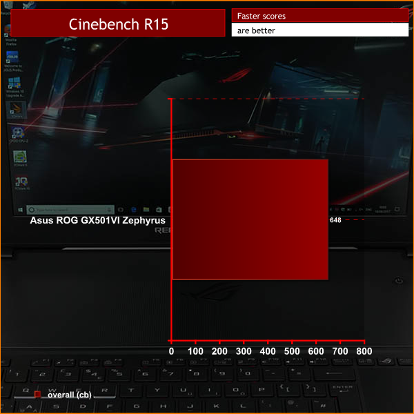 This is the interesting part. Asus has set the fan curve low to keep the noise level down with the result that both CPU and GPU idle at relatively high temperatures; 60 degrees for the CPU and 45 for the GPU. Under load when gaming the CPU remained just below 90 degrees and spiked at 94 degrees under synthetic load which made it throttle. By contrast the Max-Q GPU topped out at 79 degrees which is relatively cool for a high end Nvidia chip and emphasises the low power nature of the hardware.