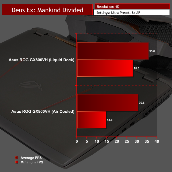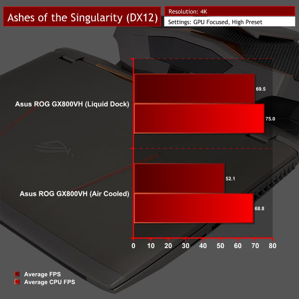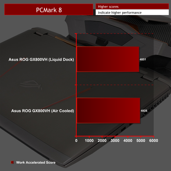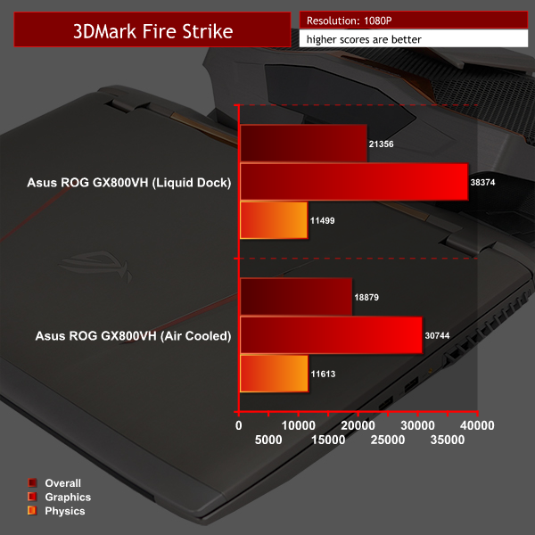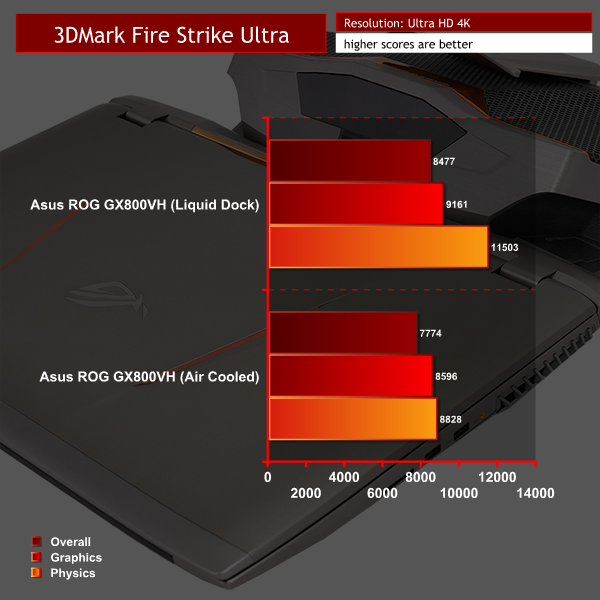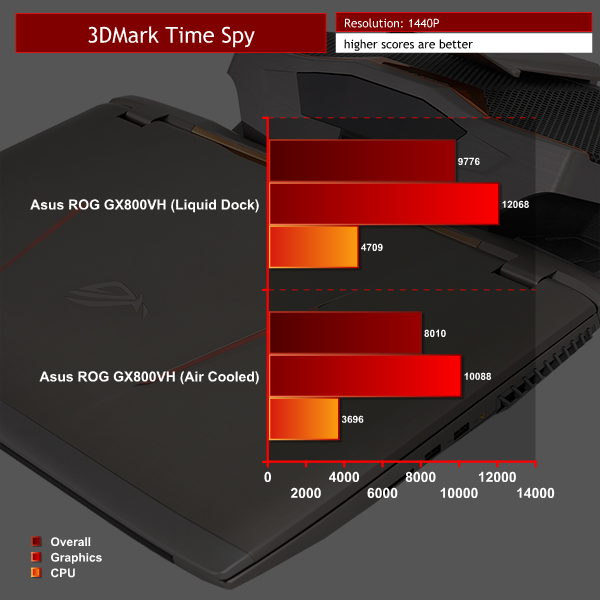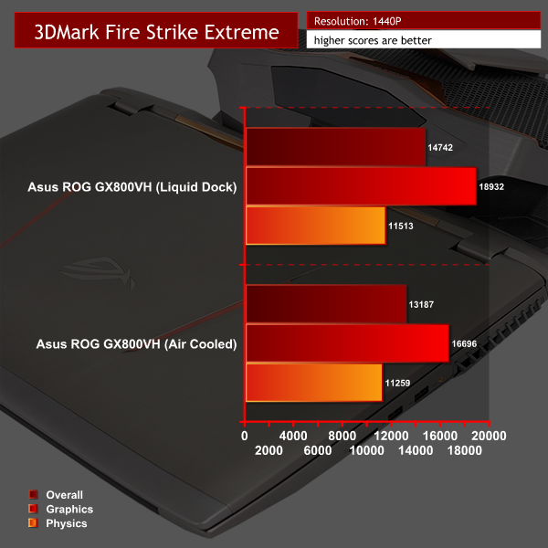 Asus GX800VH delivers superb 3DMark performance at all tested resolutions. Connecting the cooling dock delivers a noticeable performance boost thanks to the higher GPU frequencies applied.