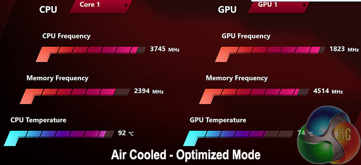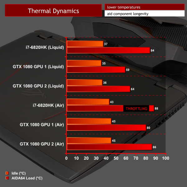 On air the GX800 runs its CPU and GPUs in the 40 degree Celsius bracket at idle and north of 80 degrees under extreme load. As we detail above, the clock speeds in each of the four modes have been carefully chosen to balance temperature and power draw. We can safely assume these figures fall within Asus’ planned limits.