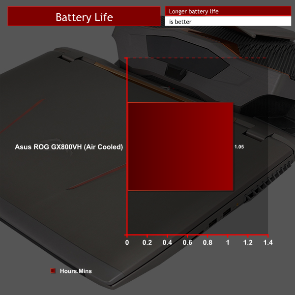 Battery life in PC Mark 8 is one hour five minutes, which equates to two hours of real world usage, but not gaming. Unless you happen to want to check an email or some other brief task the battery in this laptop is essentially irrelevant and best ignored.