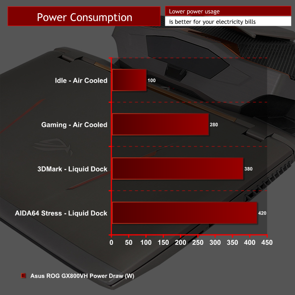 At idle, the bare laptop draws 100W, rising to 280W when gaming.