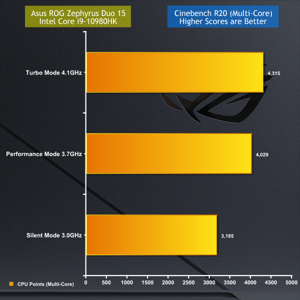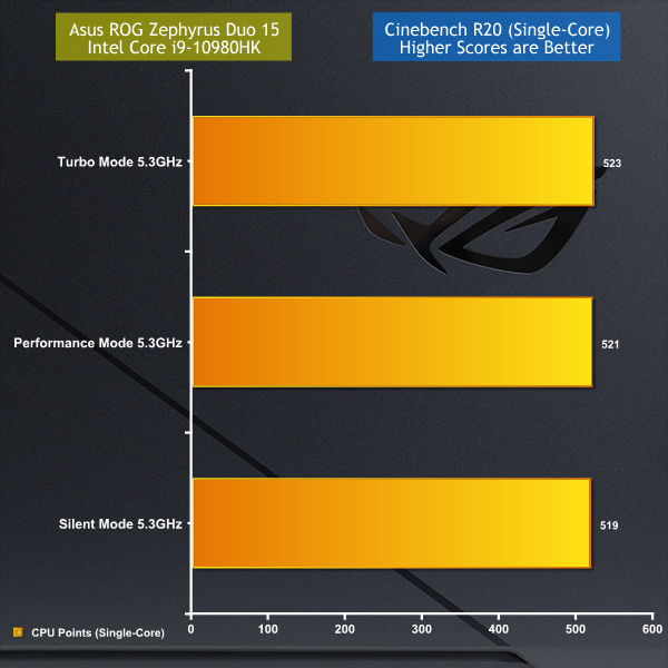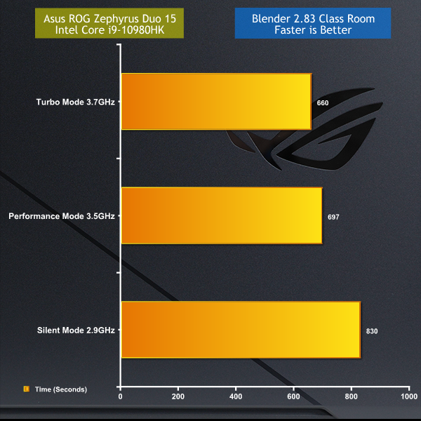 The Core i9-10980HK is limited by power and cooling as all eight cores and 16 threads pound away in Blender, which means the clock speed depends on your choice of Armoury Crate mode. The result is impressive performance that is equivalent to a desktop Core i5-10600K.