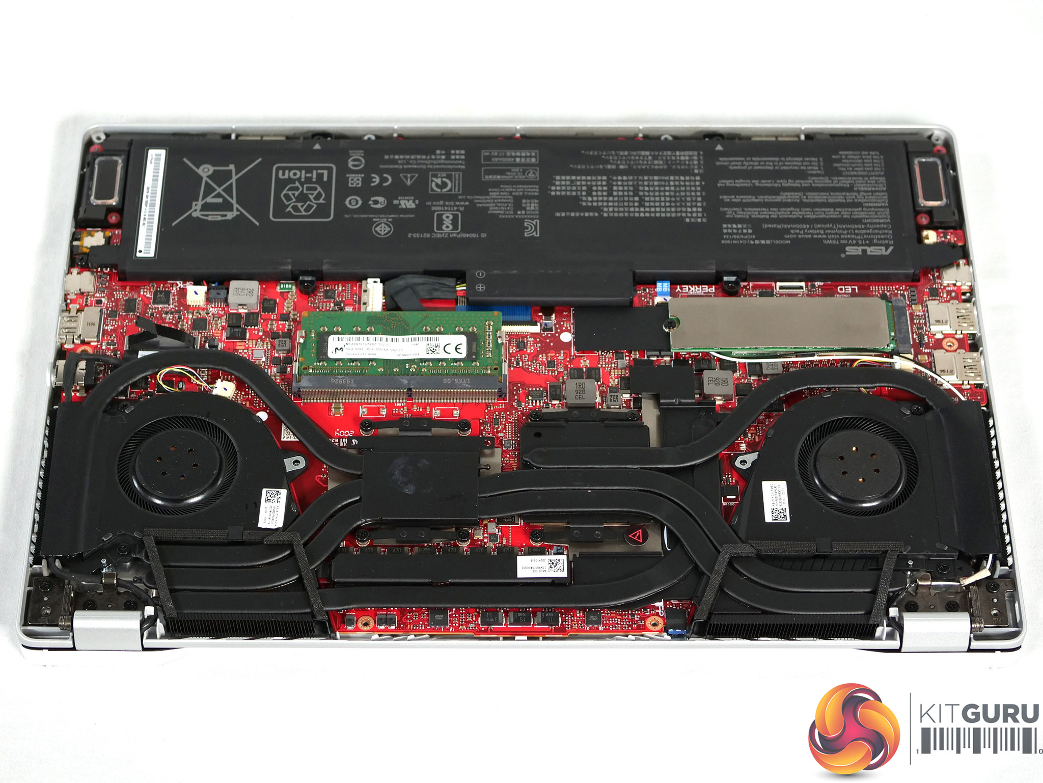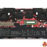 This particular version of Zephyrus G14 packs Nvidia RTX 2060 Max-Q graphics that are rated at 65W so we were gratified to see that Asus has worked hard on the cooling system in this skinny laptop. The cooling system covers the CPU, GPU and VRMs and uses five heatpipes with two cooling fans that each have 81 blades. The fan blades have lengths that alternate between 50.0mm and 51.2mm in a move to reduce turbulence, and Asus has also included their dust bypass feature that ensures the fans remain clean.