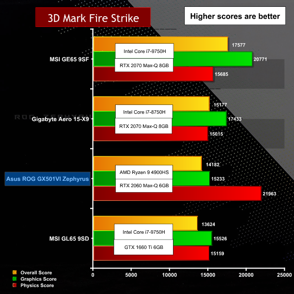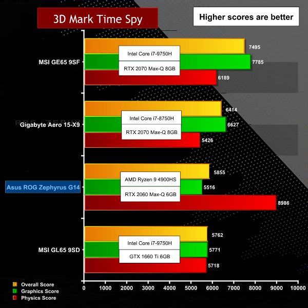 You can clearly see the CPU delivers huge levels of performance in 3D Mark while the RTX 2060 Max-Q graphics slot in exactly where you would expect, below RTX 2070 and above GTX 1660 Ti.