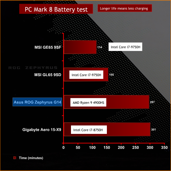 Five hours of battery life in PC Mark 8 equates to ten hours of real world duties, and that is a big thumbs up for Asus ROG Zephyrus G14.