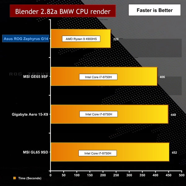 Ryzen 9 4900HS storms along with eight fast cores delivering impressive performance. It is noteworthy that single threaded performance is on a par with Intel Core i7-9750H.