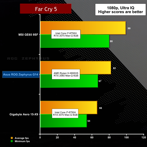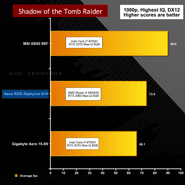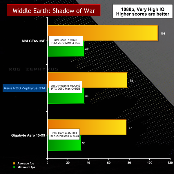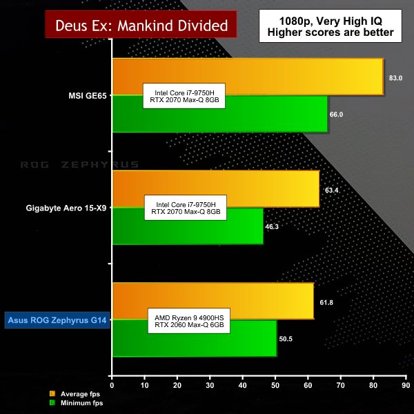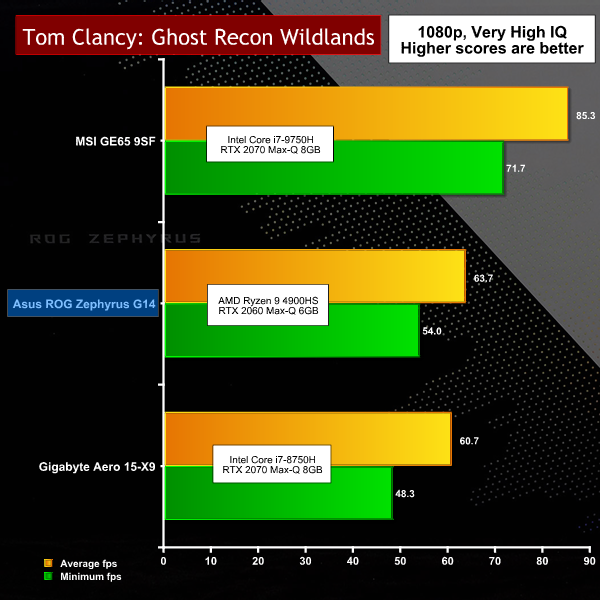 Asus ROG Zephyrus G14 demonstrates how easily it can play Full HD games with the Image Quality cranked up high. The average frame rates deliver an excellent experience while the grunty CPU and fast memory ensure the minimum frame rates are also acceptable.