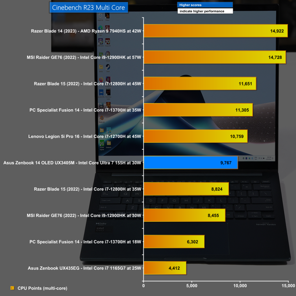 In Cinebench R23 Multi Core, using the Asus Standard Mode, we were perfectly happy with the performance. As we can see in our chart it sits between a Core i7-12800H running on 35W and a Core i7-12700H using 45W so it seems that Intel has made some useful advances in power efficiency.