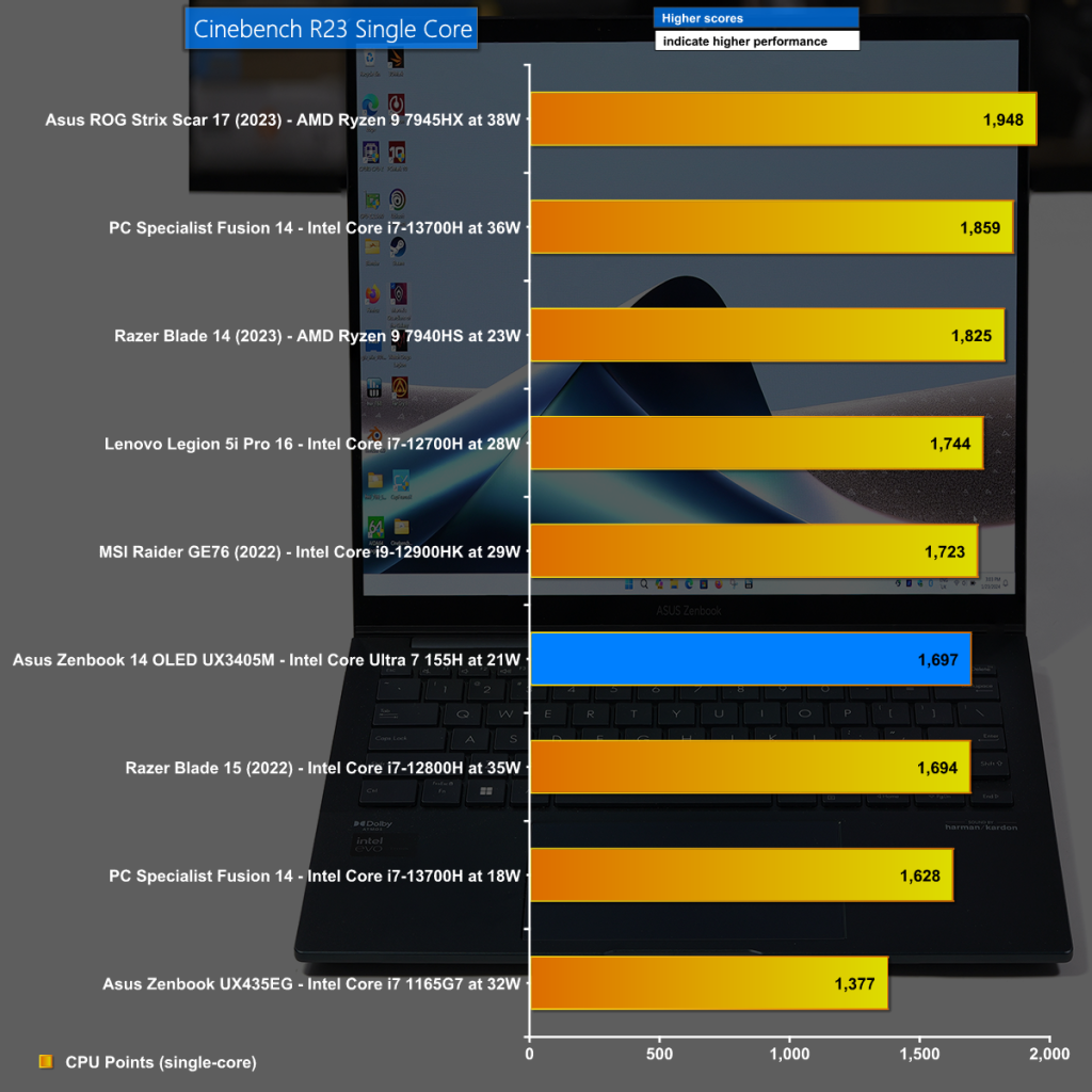 In the Cinebench R23 Single Core test the Core Ultra 7 155H does a decent job but is clearly configured to work efficiently, rather than aiming for high clock speeds and chart topping performance.