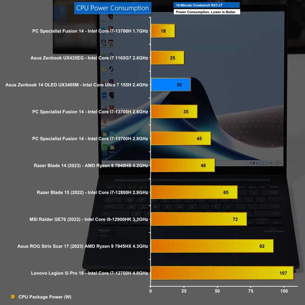 In this chart of CPU Power Draw during a run of Cinebench R23 we can see the Core Ultra 7 155H uses very little power while running in Standard Mode, and if we had chosen to use Whisper Mode it would have used significantly less power.