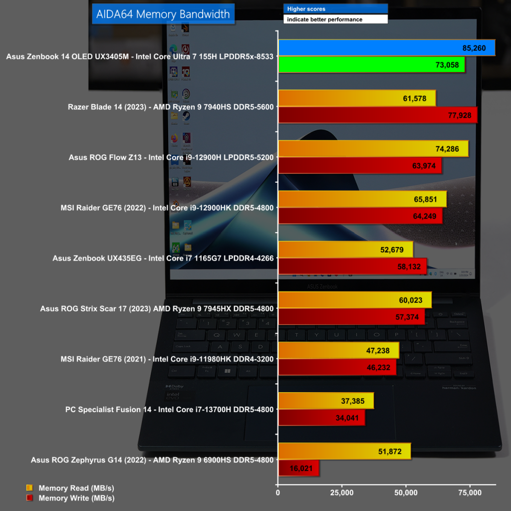 The memory used by Asus is the Zenbook 14 OLED UX3405M is 32GB of incredibly rapid LPDDR5x that is rated at 8533MT/sec in dual channel. The consequence is that this laptop stomps the AIDA64 Memory Bandwidth by a handy margin.