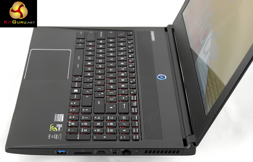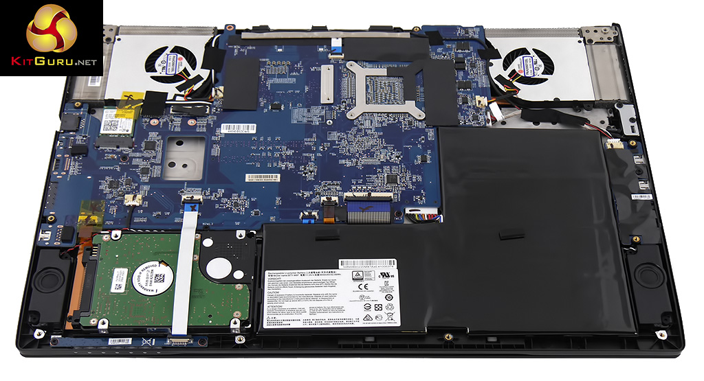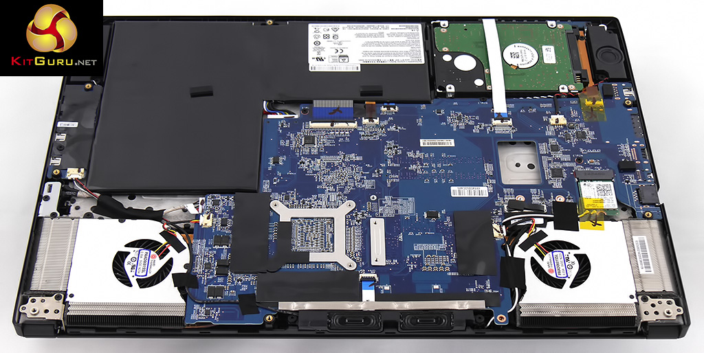 You get an impression of how little chassis there is between your fingers and the Core i7 and GTX 970M when it is working hard as the fans spin up aggressively. See our photos for a proper look at the innards. The aggressive fan speed is necessary to keep the hardware cool and it works effectively as the vented section of the underside of the chassis in the centre rises to 40 Celsius or so while the rest of the chassis remains cool.