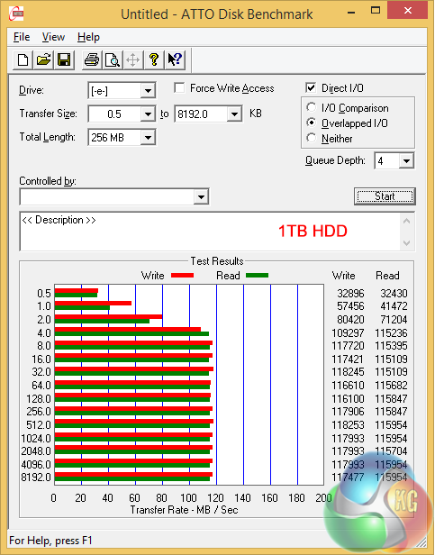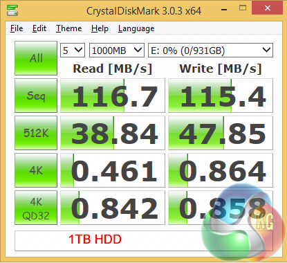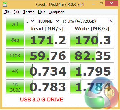 I switched to a 4TB G-Drive (Hitachi desktop drive in a USB 3.0 caddy) and saw the performance increase to 170MB/sec. It is a crying shame I didn't have a USB 3.0 Solid State Drive to hand to see whether I could get above 300MB/sec but on the plus side the barebones installation of Windows 8.1 meant the testing software ran without a hitch.