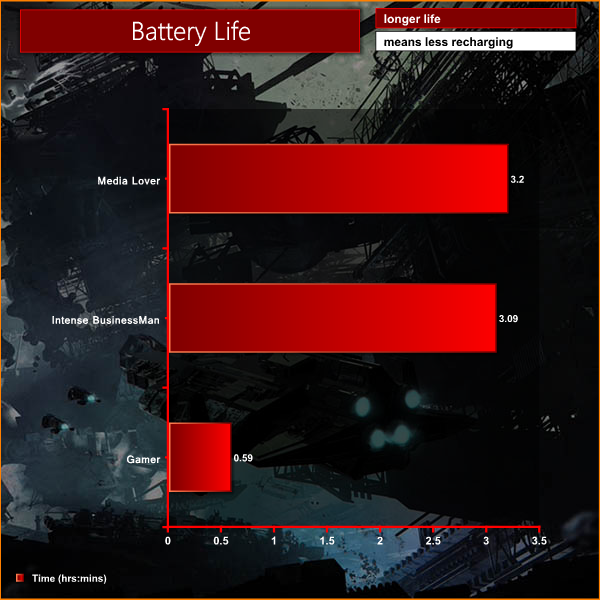 The first is traveler where I watched high definition movies wearing headphones with screen brightness two notches from maximum until the battery died. This was a Lord of the Rings-friendly 3 hours 20 minutes.