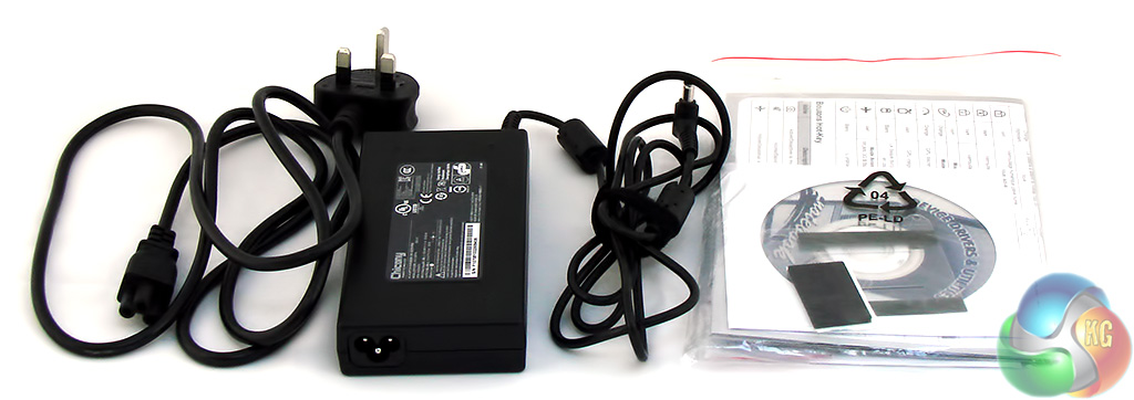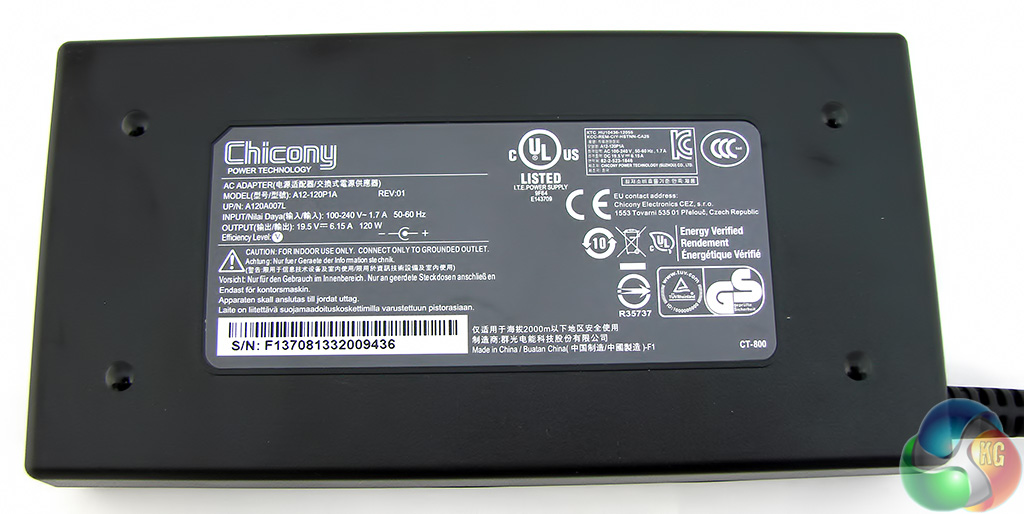 The 120W power brick is fairly flat in shape and measures 145mm x 73mm and 25mm thick. The power supply uses a clover leaf mains cord.