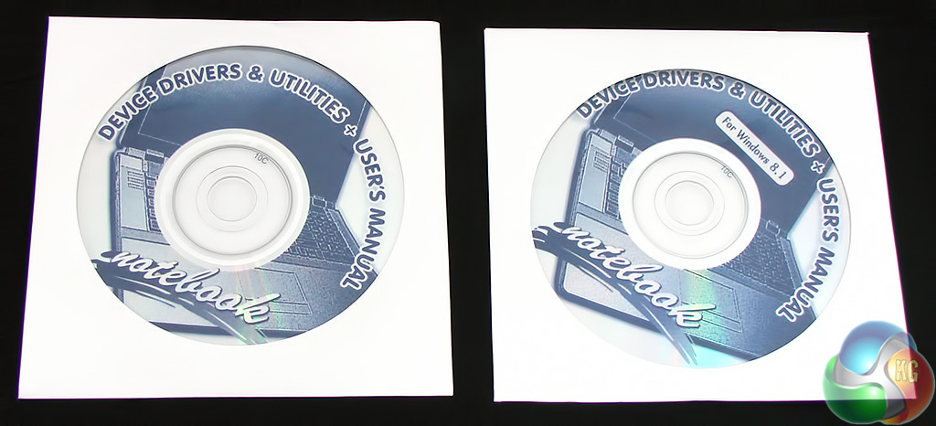 You don't get much in the way of accessories. The product guide covers three variants of this chassis (this 17.3-inch and two 15.6-inch versions). There are separate driver discs for Windows 8 and 8.1 and you get two plastic shims that you use to pack out the dual drive bays in the event you switch to a super slim hard drive.