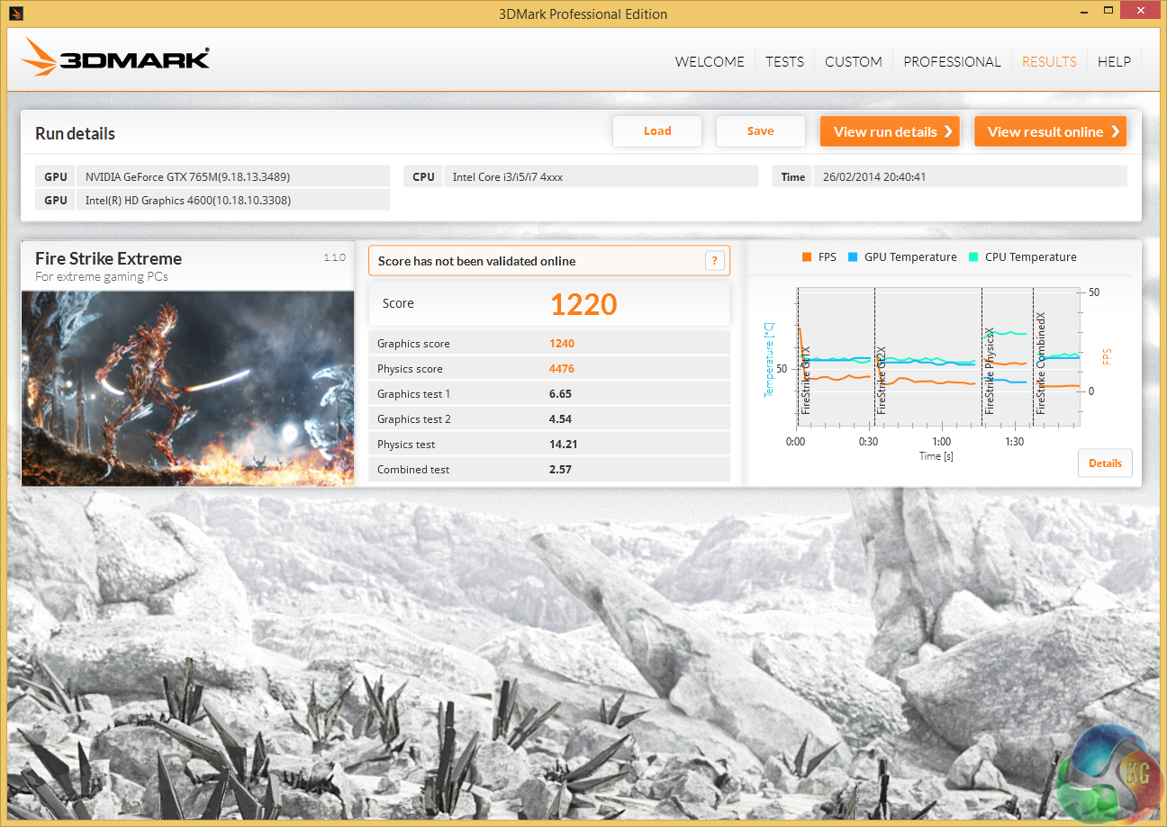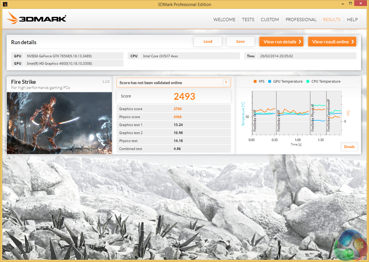 You get a clear comparison in 3D Mark Fire Strike where the MSI scored 2,238 and the DinoPC scored 2,493. In the Physics section of the benchmark the MSI scored 8,971 while the DinoPC achieved 4,466 (half the CPU cores, half the score) however that didn't have an impact on the overall score so both laptops scored equally well,