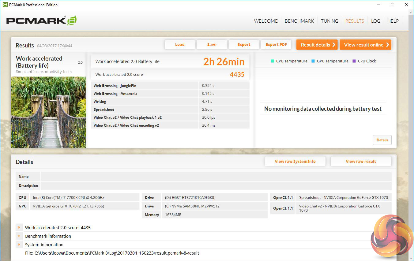 Looping PC Mark 8 continuously gave us a battery life of 2 hours 26 minutes. In the real world you can double that figure to four and a half hours which is pretty impressive for such a powerful gaming laptop.