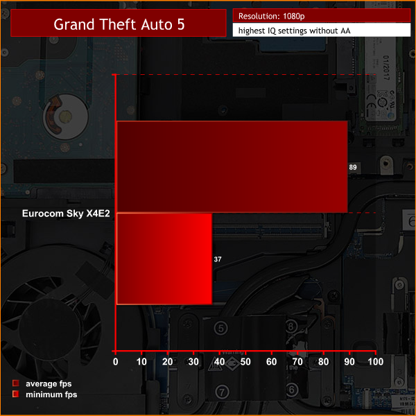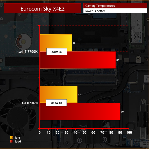 Having said all that, both the CPU and GPU were cooled sufficiently to avoid problems. The CPU topped out at 85 degrees under extreme load and the GPU hit 90 degrees. This is pushing the limits but stopping just short of throttling and Clevo and Eurocom have done a good job of keeping the temperatures under control.