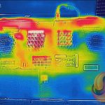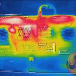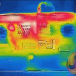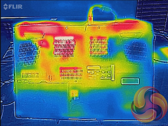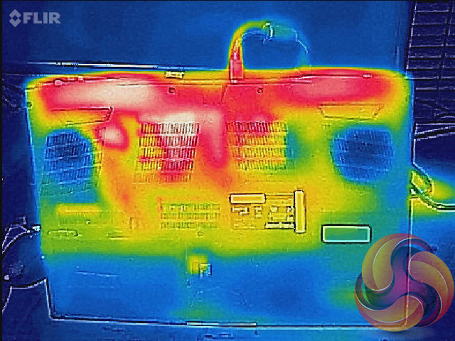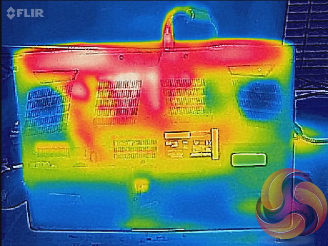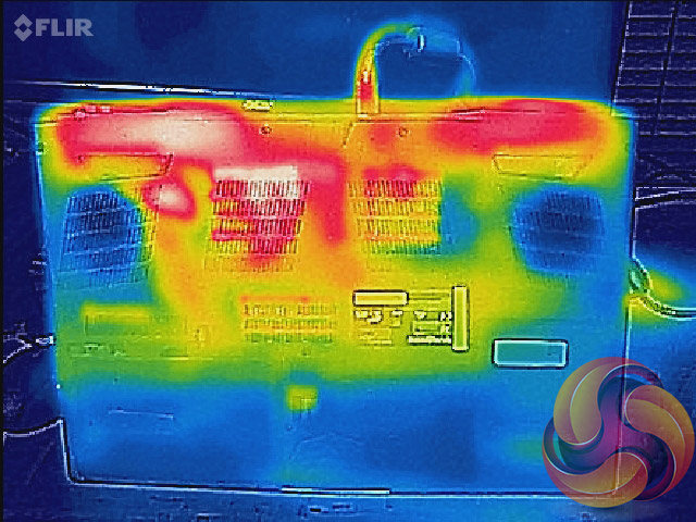 As you can see in our video and photos the cooling system inside the Eurocom Sky X4E2 looks entirely conventional with an array of heatpipes that shift the heat from the CPU, GPU and chipset and expel it through the exhausts vents at the rear. It was quite noticeable that the right hand exhaust was hotter than the left and this is reinforced by our thermal photos.