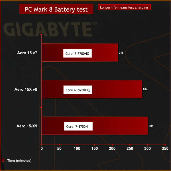 The fact that Aero 15-X9 extends battery life by some 15 minutes in PC Mark 8 suggests we either got a slightly better battery this time round or that Gigabyte has fettled the settings slightly. We continue to be impressed by Aero 15 as a series of laptops that allow all-day working.