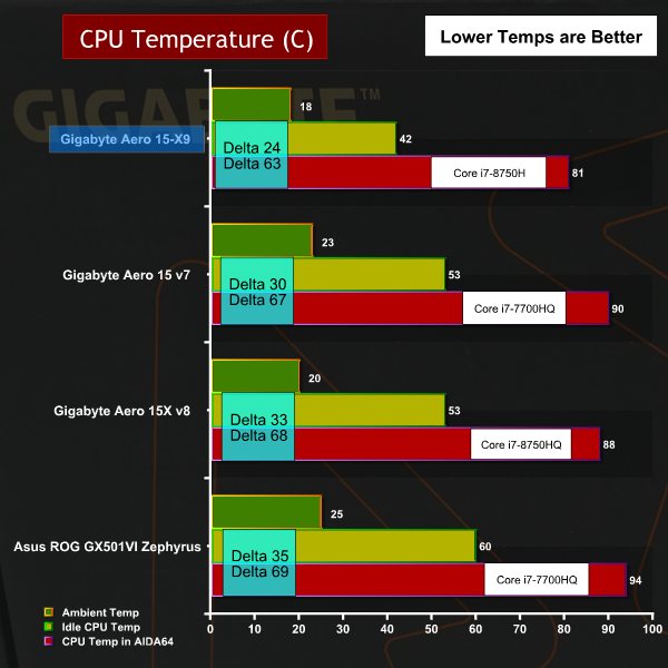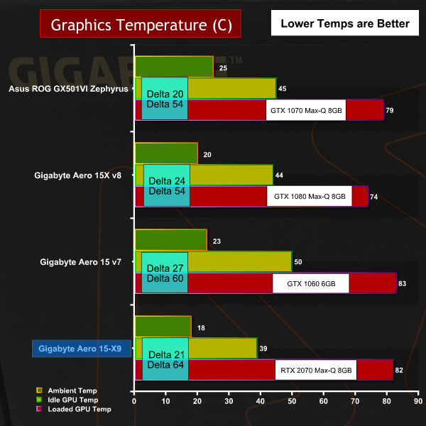 The CPU temperature is significantly lower than the previous model while the GPU temperature is higher. The cooling fans sound slightly louder in this model than previously and it seems to us that Gigabyte has ramped up the fan curve slightly to keep the new RTX graphics under control.