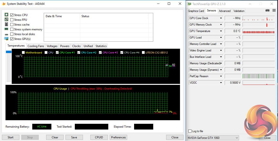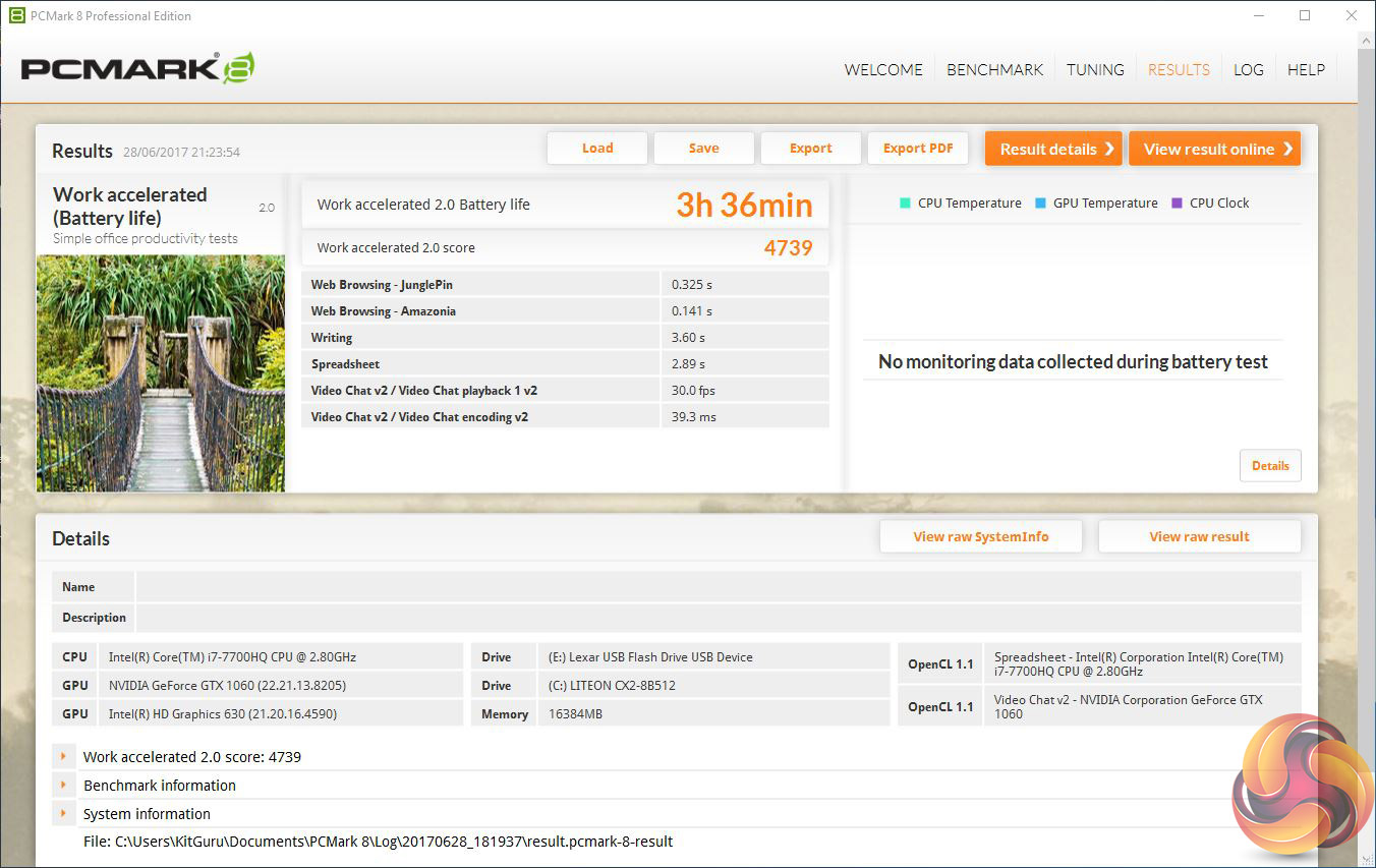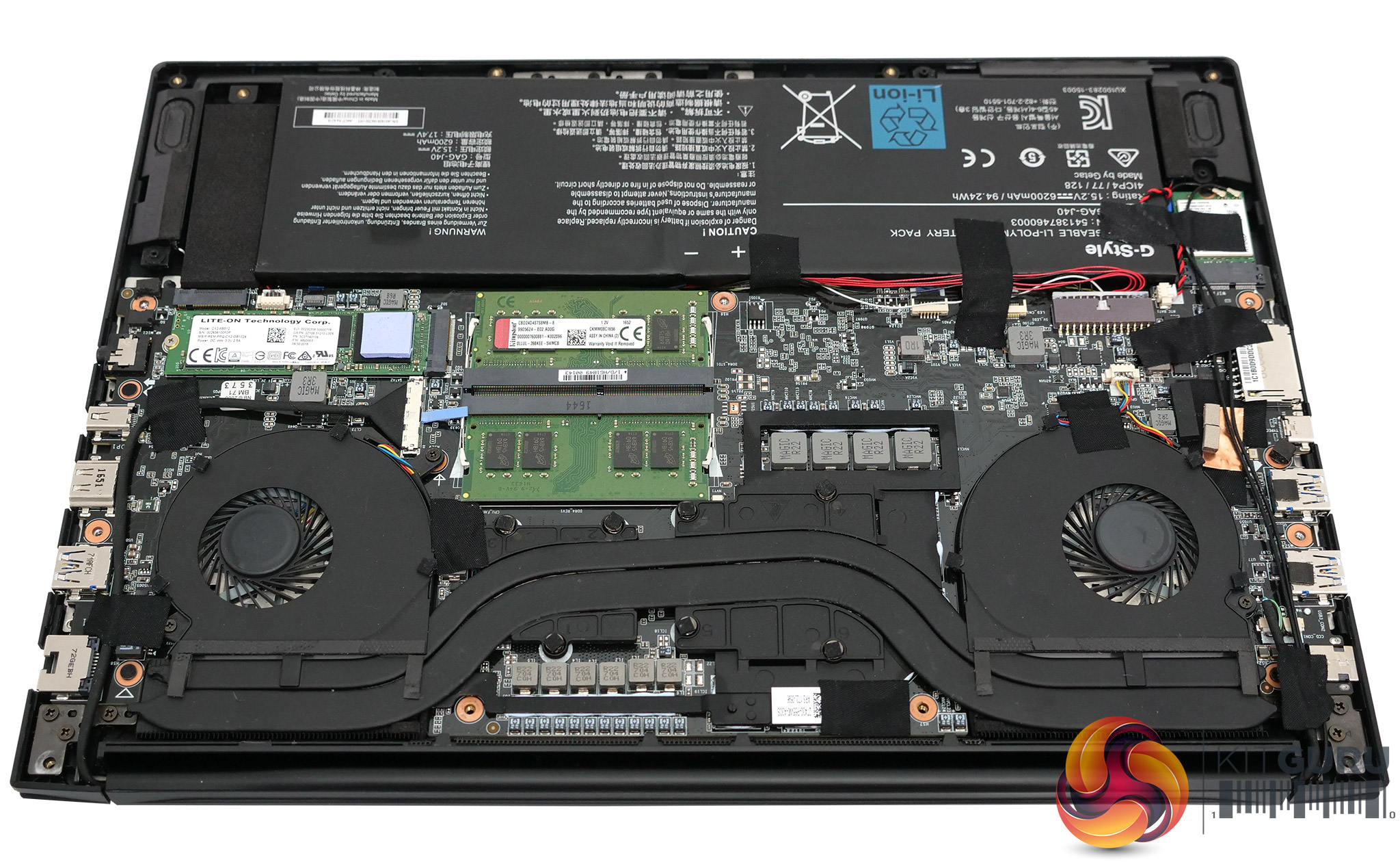 The cooling system in the Aero 15 is interesting as it draws in air from a channel in front of the screen and expels it through the ventilated bottom cover of the laptop. The heatpipes inside the laptop look quite conventional and we have no doubt the cooling system could easily manage the Core i7 and GTX 1060 chips. It seems the temperatures have been allowed to rise near the permitted limits to keep noise as low as possible.