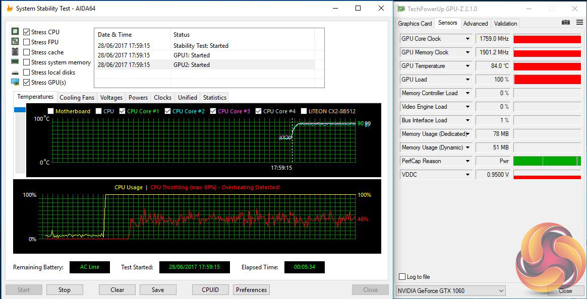 The idle temperatures are in the 50s Celsius, which is 10 to 20 degrees higher than Razer Blade. Under maximum load the Aero 15 runs the CPU at 90 degrees and the GPU at 83 degrees with obvious signs of throttling, but in regular use this wasn’t an issue.
