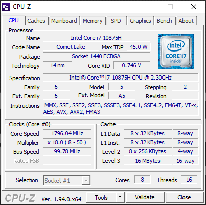 Inside the laptop we have the latest 10th Gen Intel Core i7-10875H. This model has eight cores and 16 threads and while it has a nominal 45W TDP we noted that PL2 power ramps up to 80W and then drops back to PL1 which is set at 52W. CPU base speed is 2.3GHz but the CPU runs at 3.1GHz on all cores in Blender and 3.2GHz in Cinebench R20, which are very useful speeds in a laptop. More impressively, single core boost is a mighty 4.9GHz so you get instant response in lightly threaded workloads.