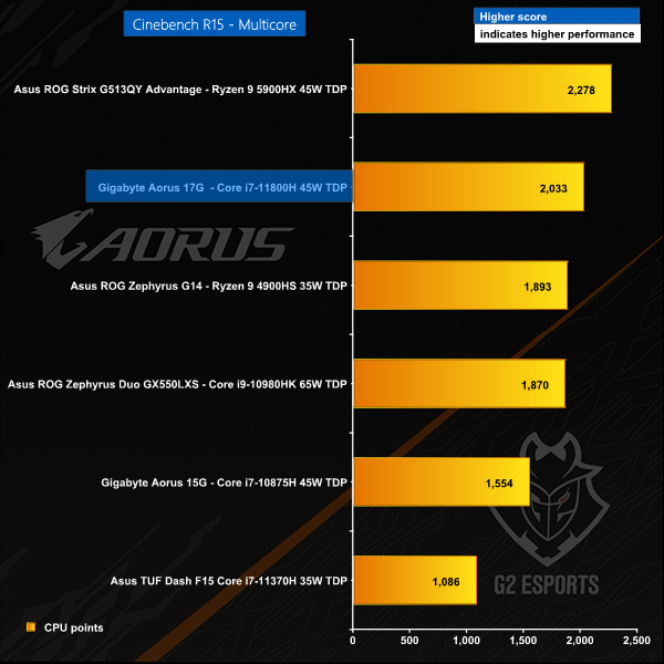 In Cinebench R15 the Aorus 17G does a decent job, however the eight core Tiger Lake H requires 95W to run at 4.2GHz on all cores, which is 20W more than the AMD Ryzen 9 5900HX.This is a rapid test and the cooling system handles the task without difficulty.