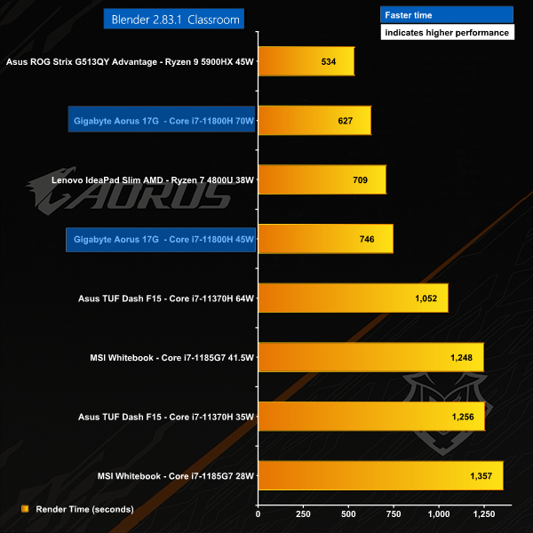 In Blender Classroom you will note there are two entries for the Core i7-11800H. The slower run with 45W of CPU power is unimpressive while the faster 70W run is heading in the direction of Ryzen 9 5900HX, although it is clear the Intel CPU is significantly more inefficient.