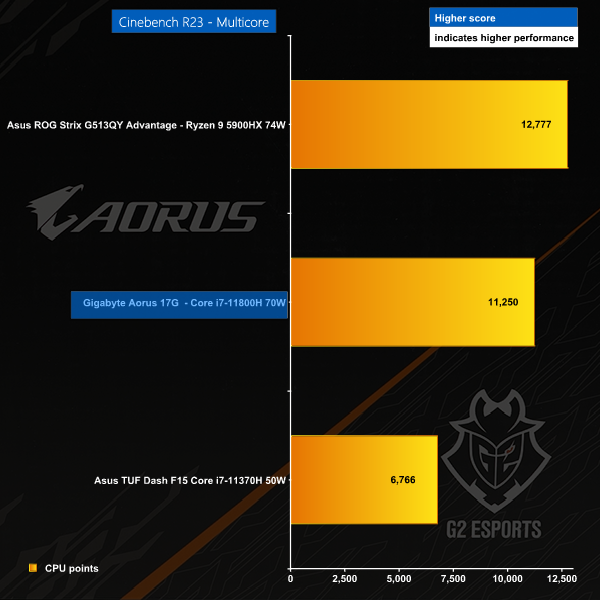 Cinebench R23 is a tough test that demonstrates the problem faced by Gigabyte when it packaged the Core i7-11800H. The quad core Tiger Lake in the Asus TUF Dash F15 drew 50W to run at 4.2GHz so Gigabyte would presumably require 95W once again to achieve the same speed. Unfortunately Cinebench R23 runs for an extended period so the laptop instead feeds 70W to the CPU and as a result the clock speed drops to 3.7GHz