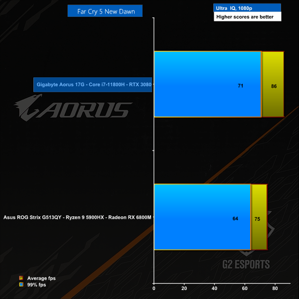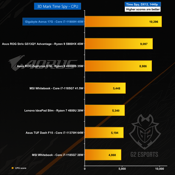 The Gigabyte Aorus 17G has a brand new eight core Tiger Lake CPU driving RTX 3080 16GB graphics to a Full HD panel so there was never any question of whether it could play games. Yes it can and it does it very well. The surprise comes when you see how this laptop compares to the Asus ROG Strix G513 Advantage Edition with AMD Ryzen 9 5900HK CPU and Radeon RX 6800M graphics as the Gigabyte puts up a stiff fight. We were looking for signs of the Core i7-11800H letting the side down but in fact both the CPU and GPU do a fine job for gamers.