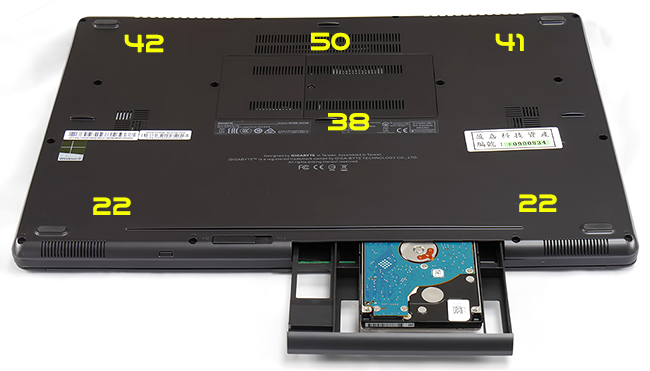 When the Gigabyte was idling on the Windows desktop I measured 22c degrees at the front corners (empty drive bay and battery) and 26c and 29c degrees at the back corners (CPU and GPU coolers) with a high point of 41c degrees at the central exhaust vent.
