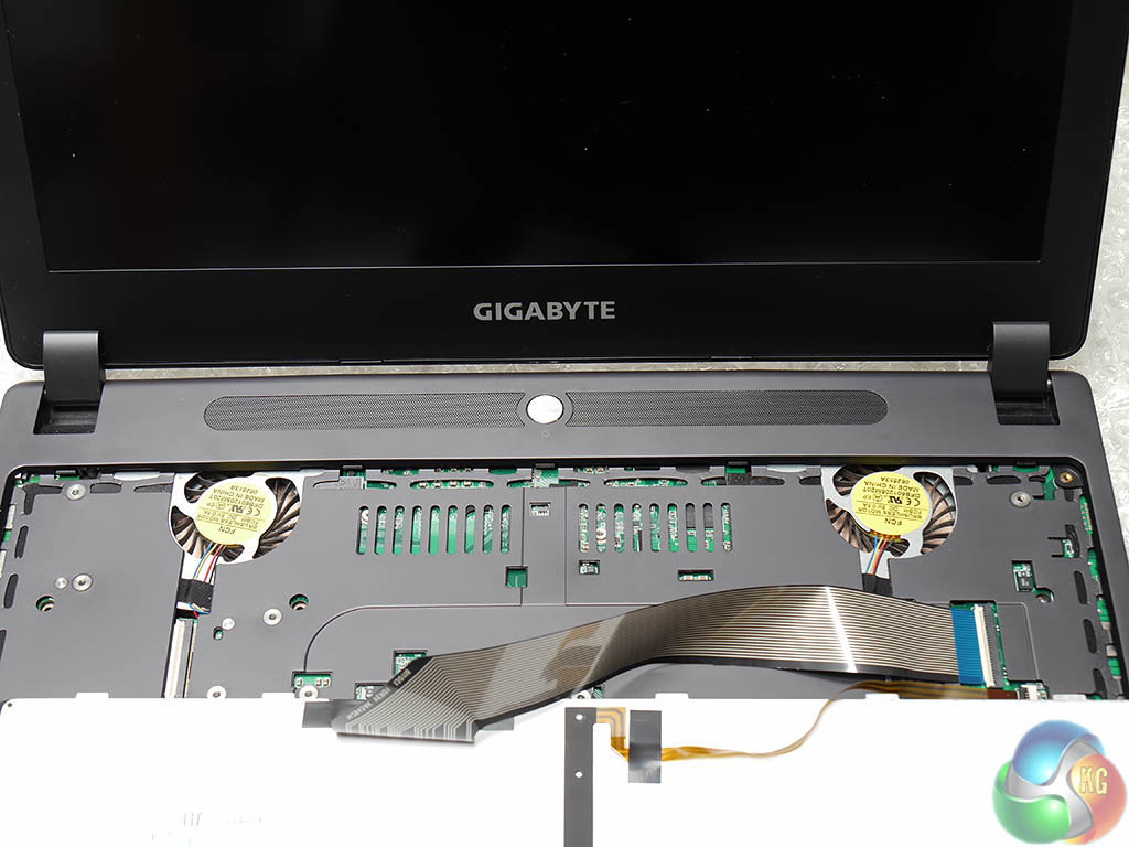 Remove four screws on the underside of the chassis and the keyboard can be lifted out to reveal the two cooling fans. The funky background in my photo is some bubble wrap that I laid under the laptop to avoid any risk of scratching or damage.
