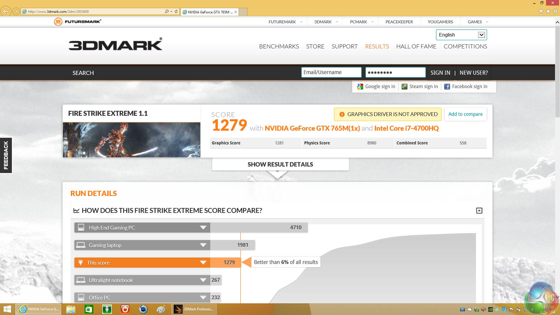 3D MARK showed the Gigabyte had slightly higher performance than the DinoPC Pegasus. This is what I expected to see as both laptops use the same Nvidia GTX 765M yet the Gigabyte has more recent drivers and a core i7 CPU rather than Core i5 which helps the Physics score along.