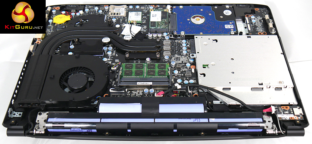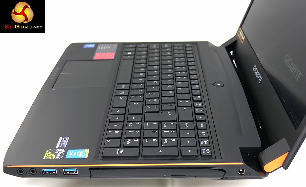 The cooling system uses heat pipes to remove heat from both the CPU and GPU and then take it to the left side of the laptop where is is exhausted. The DVD drive occupies the right hand side, otherwise Gigabyte might have used a twin cooler approach. The result of using a single cooler on two pieces of performance silicon is that it can get a bit noisy, and it was also notable that the cooler would spin into life as soon as the laptop was placed under any sort of load.