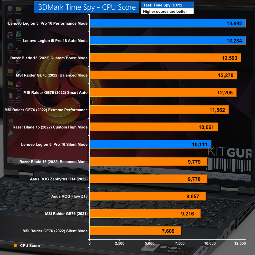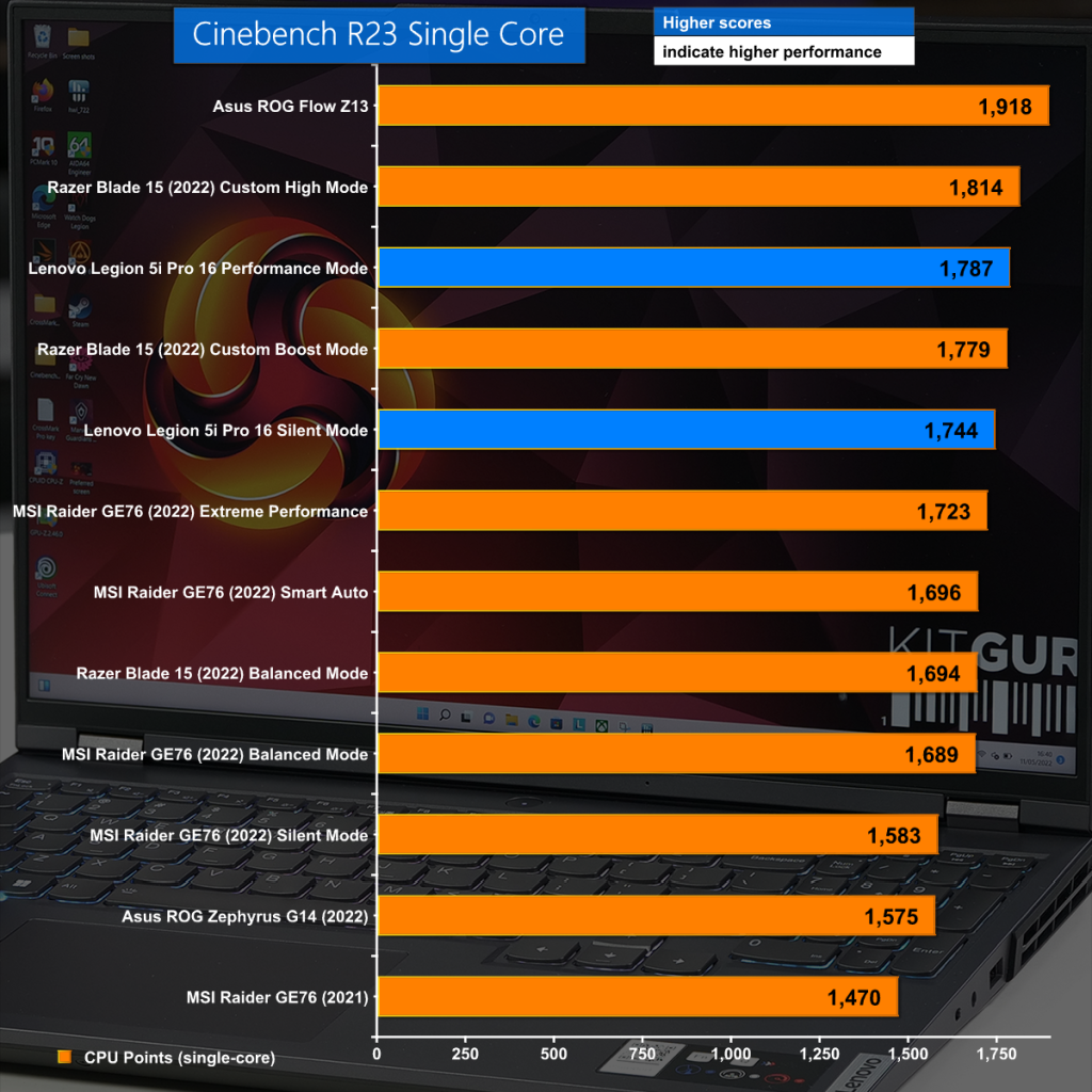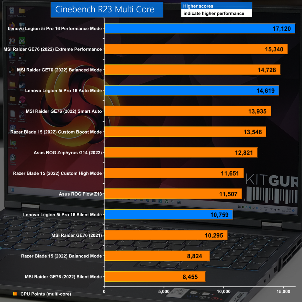 In our Cinebench R23 Multi Core we are comparing the Lenovo Legion 5i Pro 16 with the MSI GE76 Raider and Razer Blade 15 that we recently reviewed. On paper those laptops have superior CPUs to the Lenovo however our test results tell a different tale. Depending on the power mode you select the Lenovo can either perform OK, very nicely or absolutely amazingly.