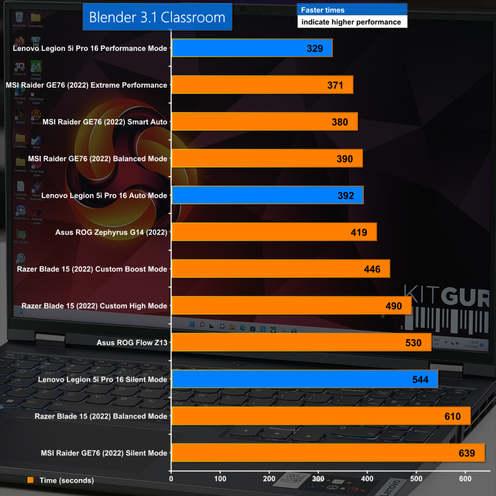 In Blender we see a similar story to Cinebench with Lenovo powering to the top of the chart.