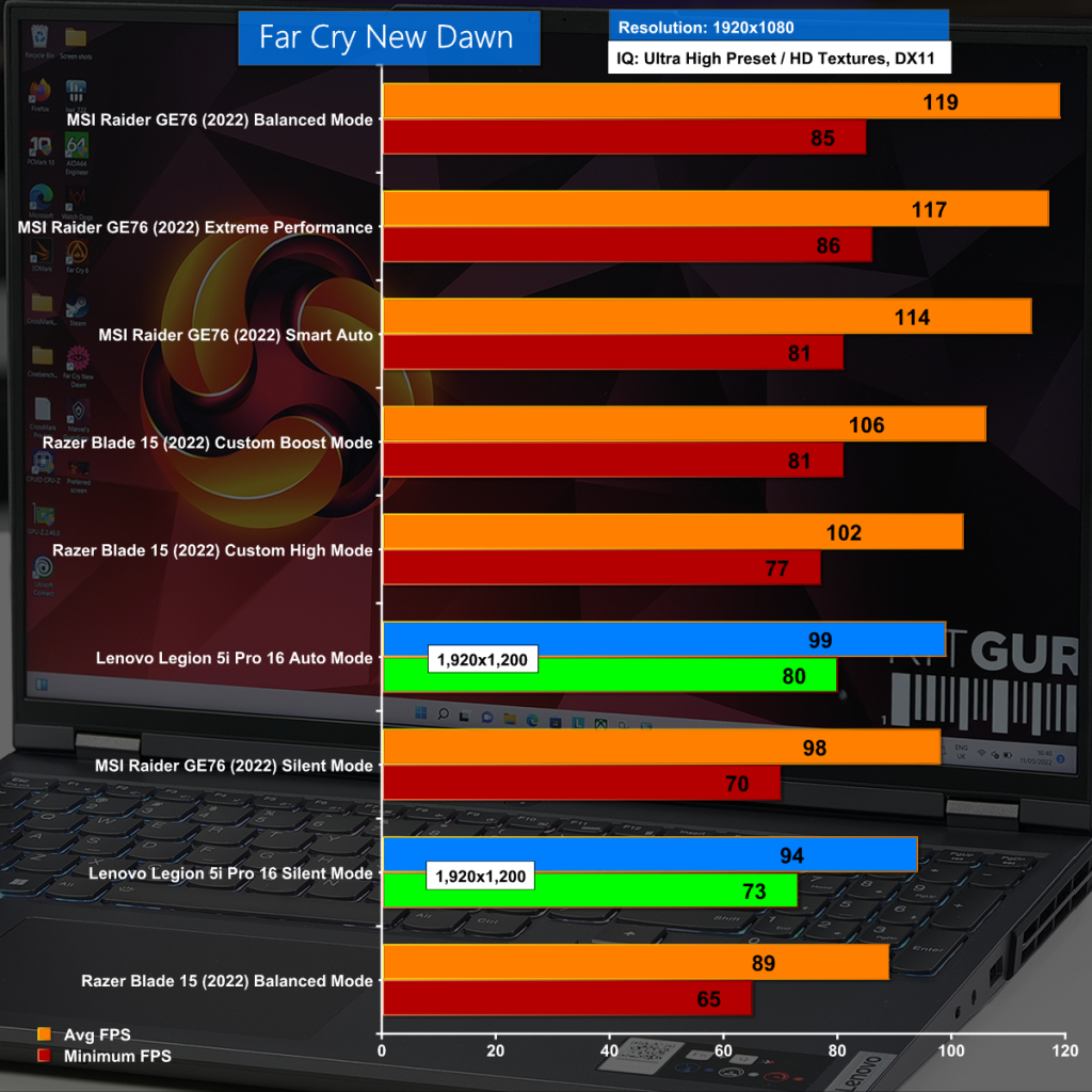 The unusual screen resolution of 2,560×1,600 clashes with Far Cry New Dawn and means we had to test at 1,920×1,200 rather than at 1,920×1,080. In addition the Lenovo has RTX 3060 graphics which are overshadowed by the competition yet despite that the frame rates are good and the gaming experience is very acceptable.
