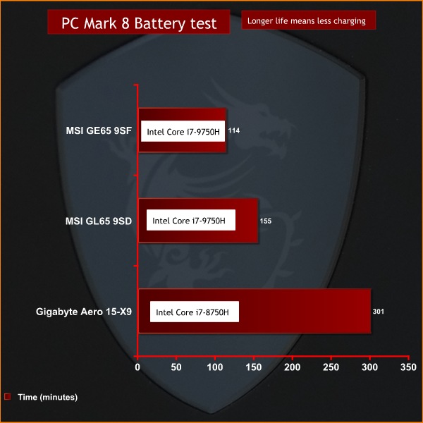 Balanced against that, battery life is unimpressive, especially in the case of GE65. Gigabyte shows the benefits of a battery that has a decent capacity where by contrast MSI uses a modest 51Wh battery in both models and the result is telling.