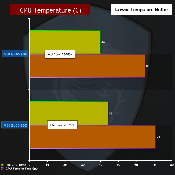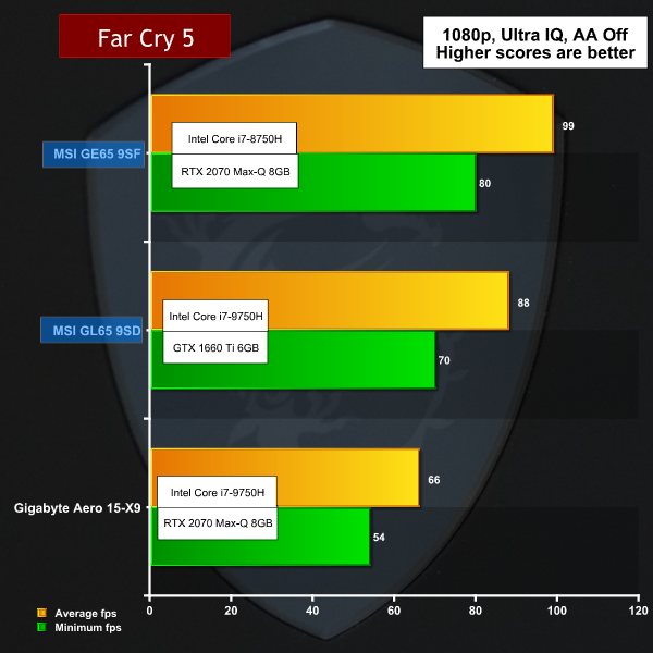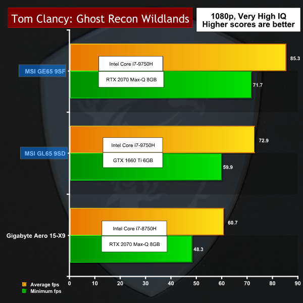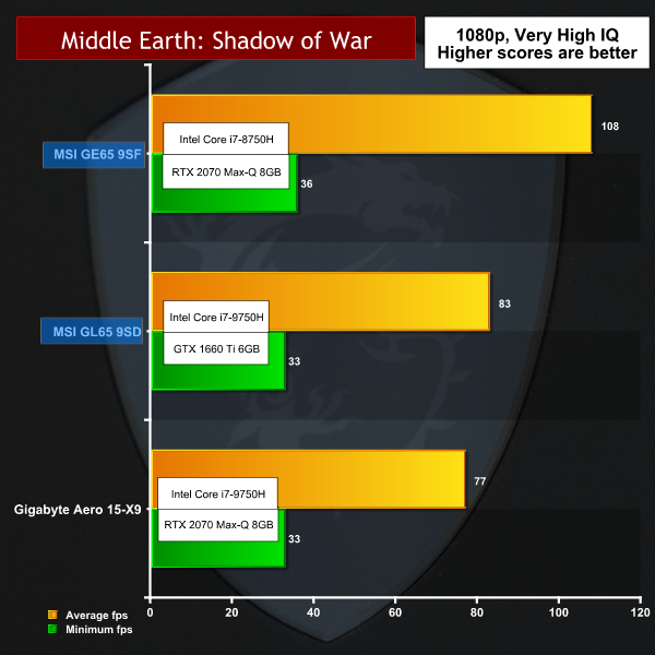 Throughout our games testing the GL65 performed well, proving that GTX 1660 Ti graphics are quite effective at 1080p gaming (as if we needed to be reminded of that fact). GE65 stormed through our games tests and it was interesting to see that the historic figures we used from our review of Gigabyte Aero 15-X9 were significantly slower than both GL65 and GE65 even though the Gigabyte hardware is very similar to the specification of GE65.
