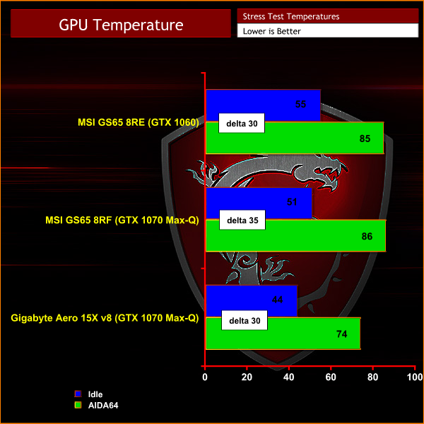 The same is true of the GPU which runs at 85 degrees under load, however the fact that both GTX 1070 Max-Q and GTX 1060 GPUs in 8RF and 8RE versions operate at the same temperature was unexpected as we thought the GTX 1060 might run a bit cooler.