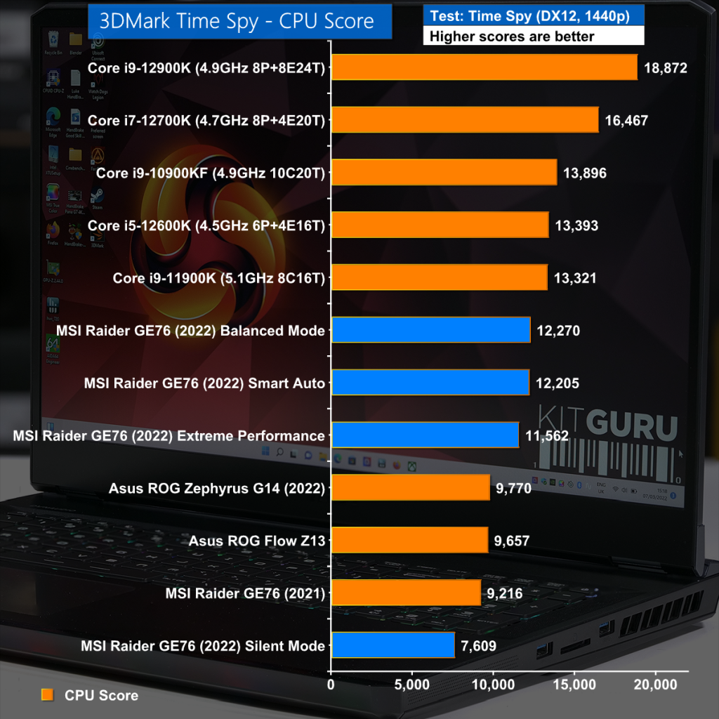 In the CPU Test of 3D Mark Time Spy we see the 2022 version of Raider GE76 making significant progress over the 2021 laptop. Intel's 12th Gen Core i9-12900HK is impressive.