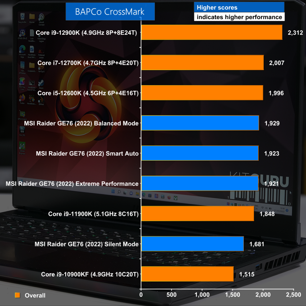BAPCo CrossMark favours Intel's new 12th Gen CPUs with their hybrid architecture and we see the mobile CPU in this laptop competing impressively well with their desktop cousins, despite running at lower clock speeds on less power.