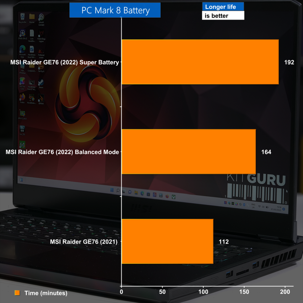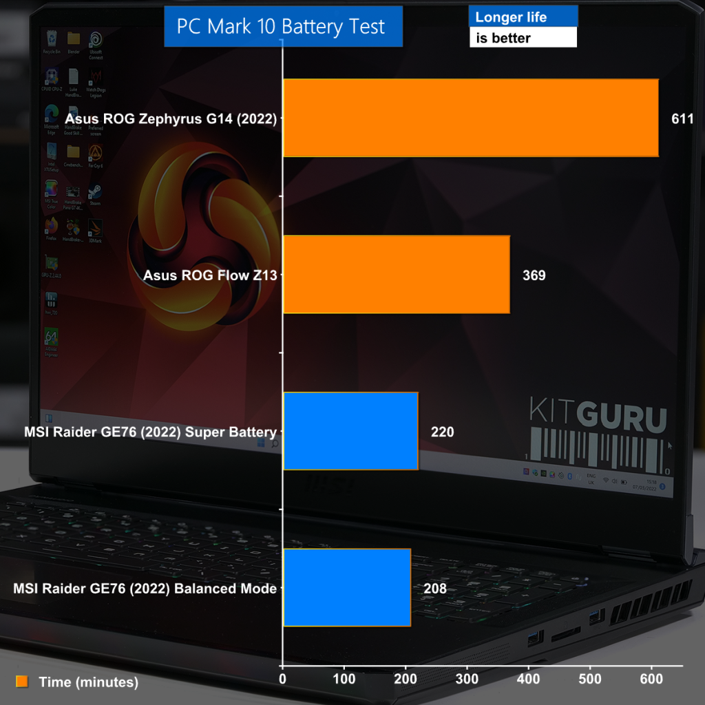 In PC Mark 10 the new MSI looks rather limp compared to both the Asus ROG Flow Z13 and in particular the new Asus ROG Zephyrus G14. MSI has loaded this GE76 with performance hardware, which explains how the battery life gets trounced by the thin and light Flow Z13. A brief glance at the result for the Zephyrus tells us that AMD is winning the power efficiency battle with ease.