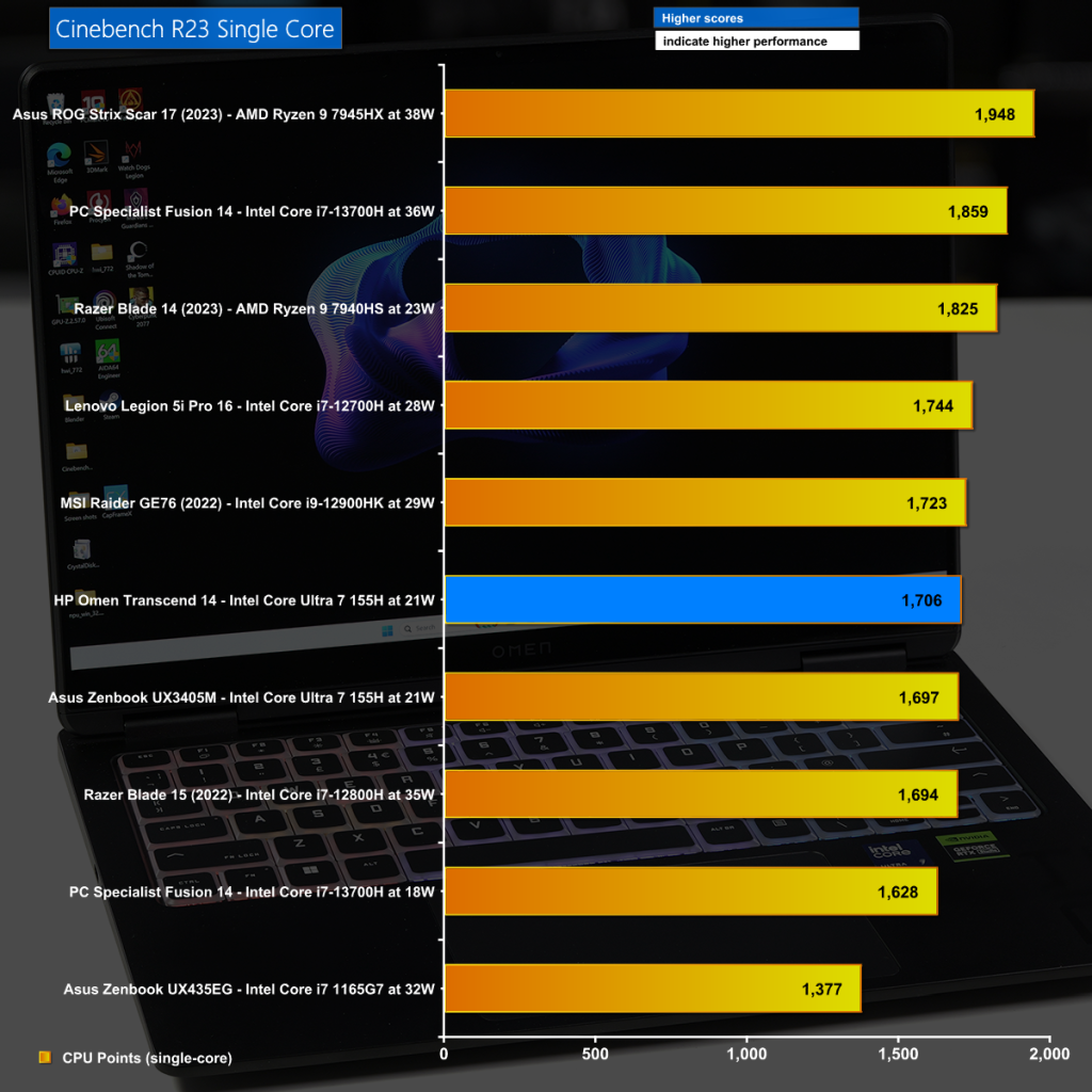 The HP Omen is off to a good start in Cinebench R23 Multi Core where we see the extra power allows the Intel CPU to deliver decent levels of performance.